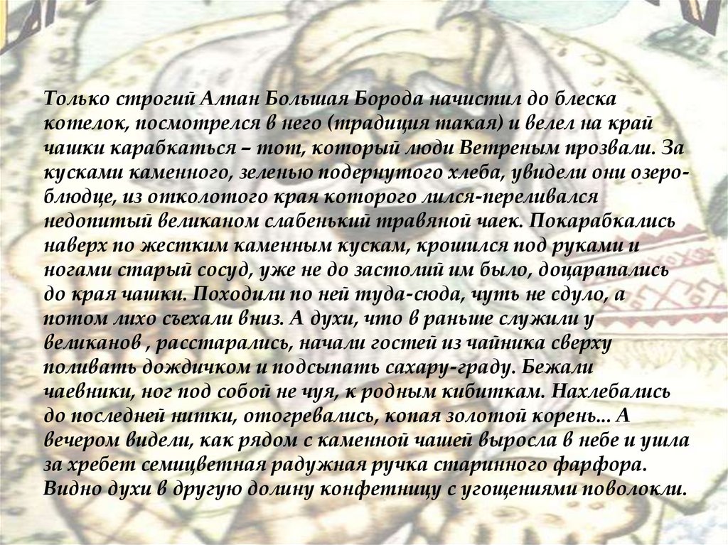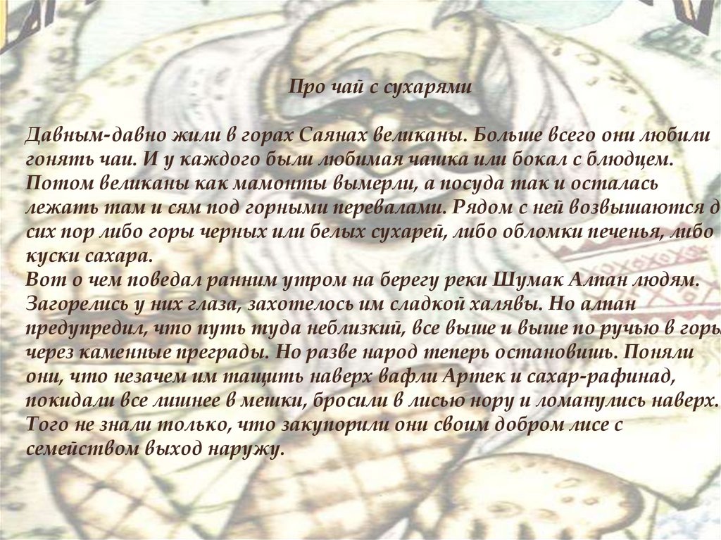 Про чай с сухарямиДавным-давно жили в горах Саянах великаны. Больше всего они любили