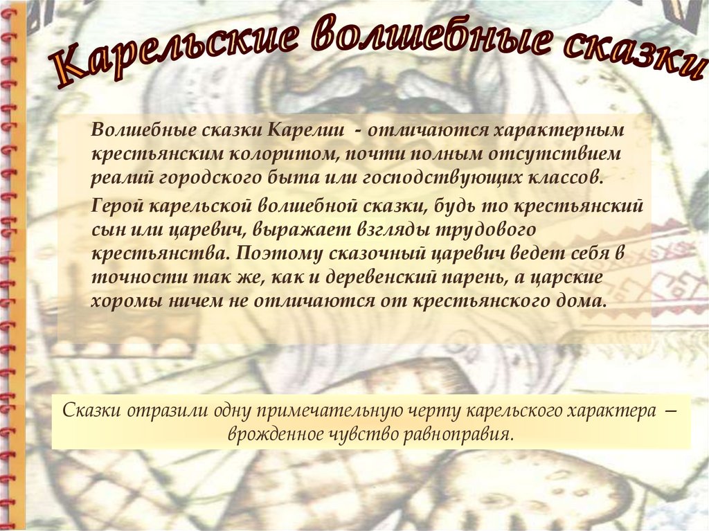 Волшебные сказки Карелии - отличаются характернымкрестьянским колоритом, почти полным отсутствием