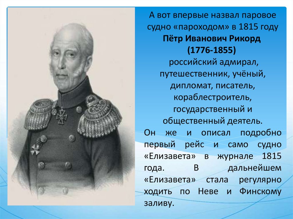 А вот впервые назвал паровоесудно «пароходом» в 1815 году