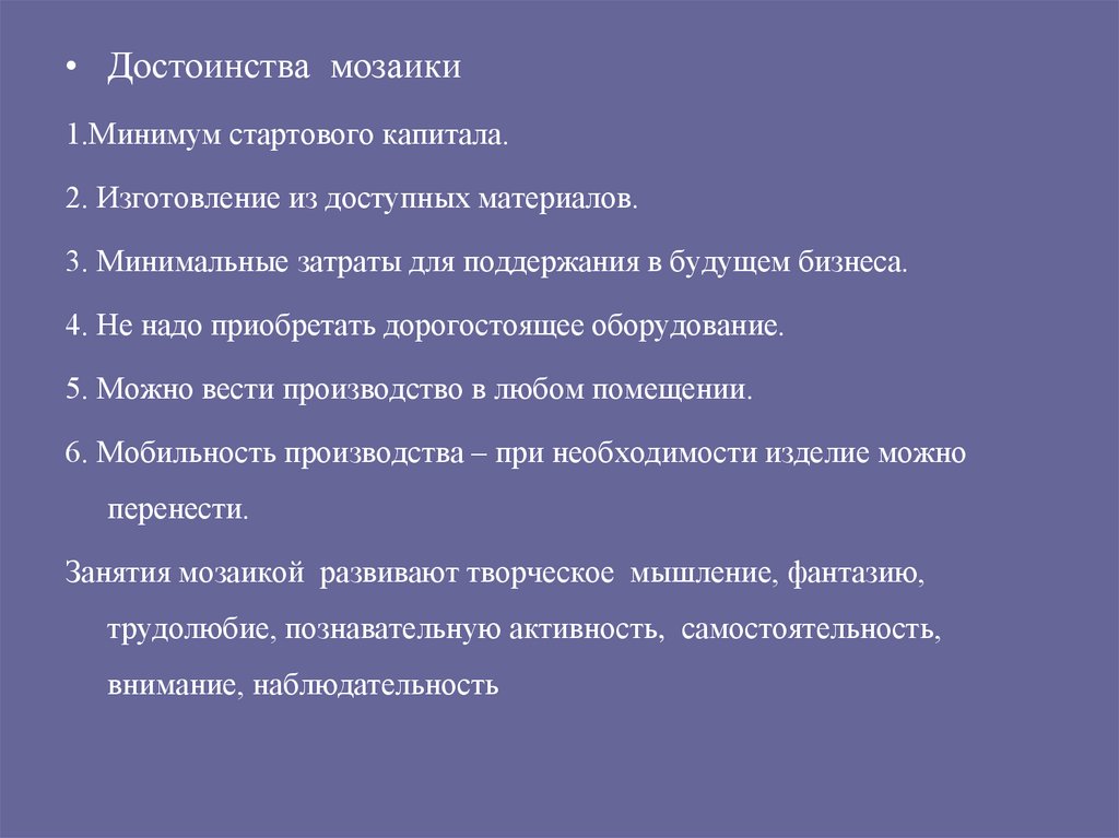 • Достоинства мозаики1.Минимум стартового капитала.