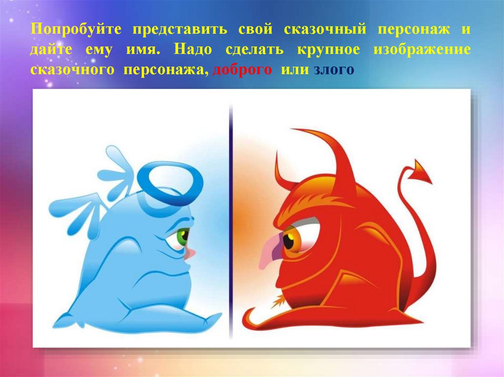 Попробуйте представить свой сказочный персонаж идайте ему имя. Надо сделать крупное изображение