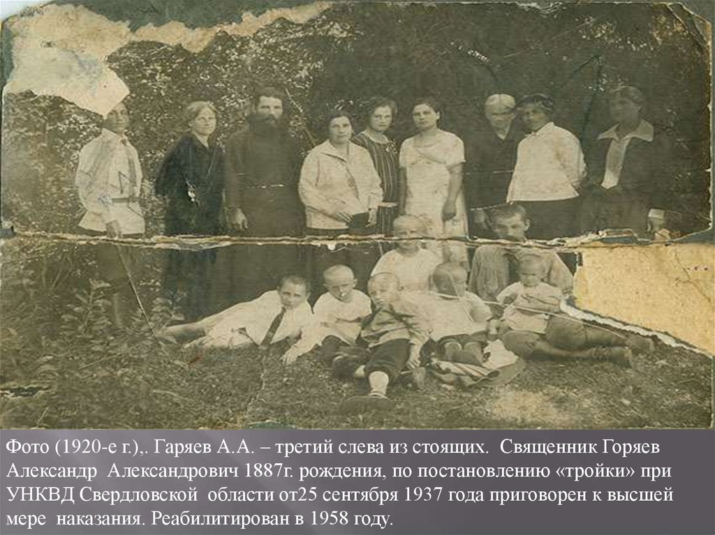Фото (1920-е г.),. Гаряев А.А. – третий слева из стоящих. Священник ГоряевАлександр Александрович 1887г. рождения, по постановлению «тройки» при