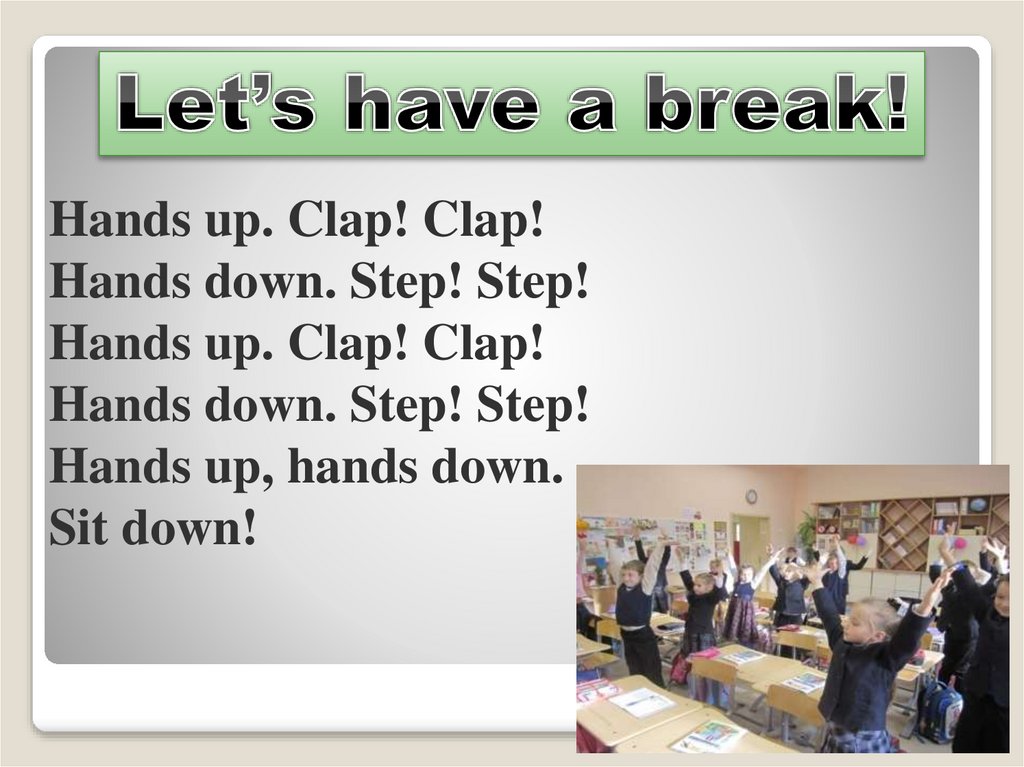 Hands up. Clap! Clap!Hands down. Step! Step!