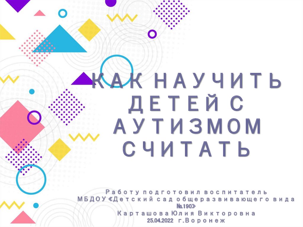 1. КАК НАУЧИТЬ ДЕТЕЙ С АУТИЗМОМ СЧИТАТЬ Работу подготовил воспитатель МБДОУ «Детский сад общеразвивающего вида №190» Карташова