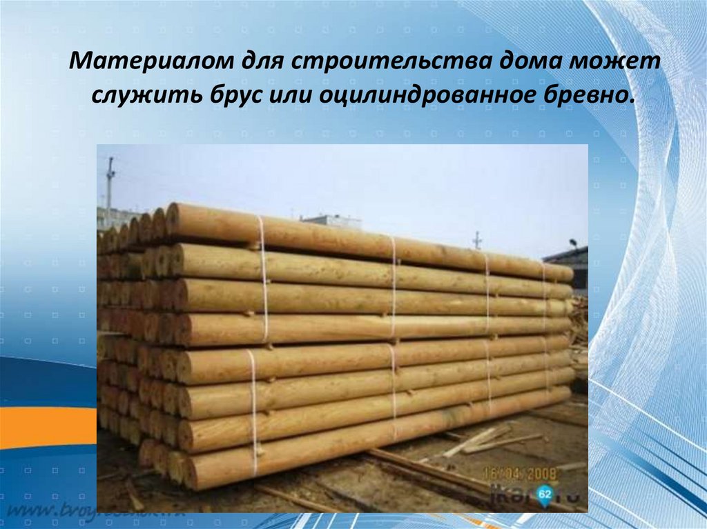 Материалом для строительства дома можетслужить брус или оцилиндрованное бревно.