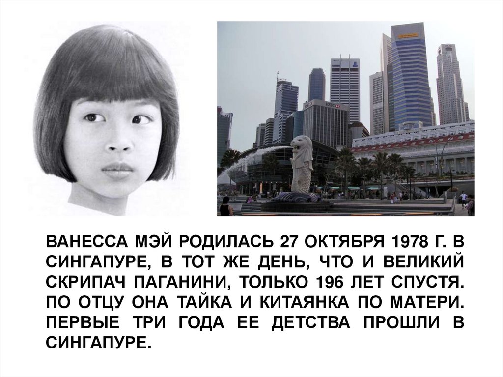 ВАНЕССА МЭЙ РОДИЛАСЬ 27 ОКТЯБРЯ 1978 Г. ВСИНГАПУРЕ, В ТОТ ЖЕ ДЕНЬ, ЧТО И ВЕЛИКИЙ