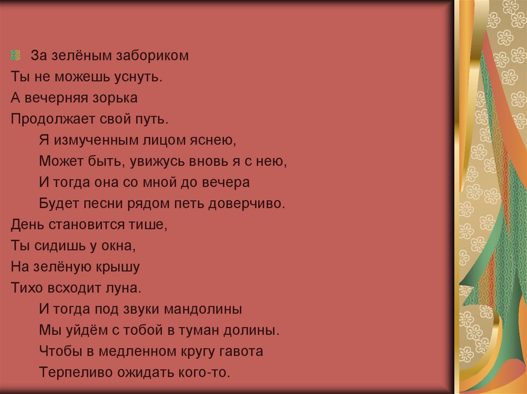 За зелёным заборикомТы не можешь уснуть.