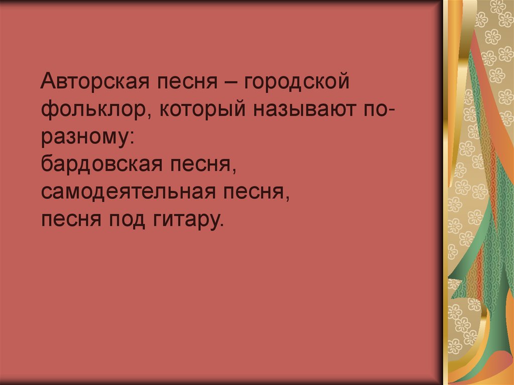 Авторская песня – городскойфольклор, который называют поразному:
