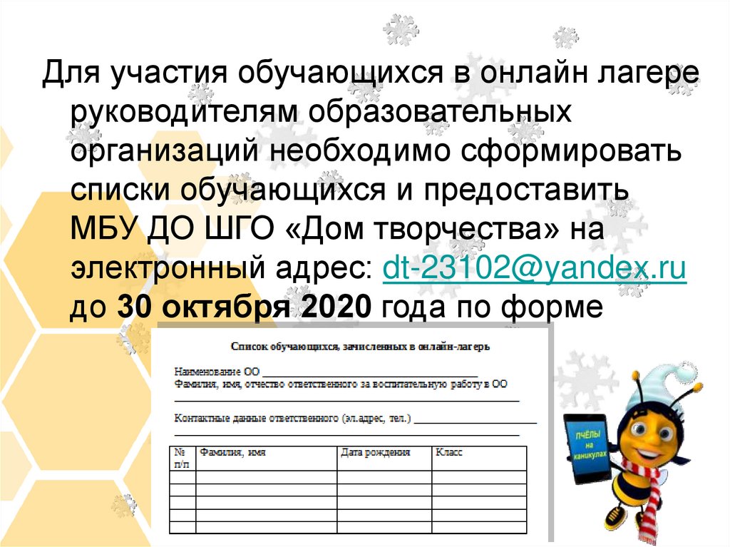 1. Онлайн лагерь «ПЧЁЛЫ НА КАНИКУЛАХ» 2-6 ноября