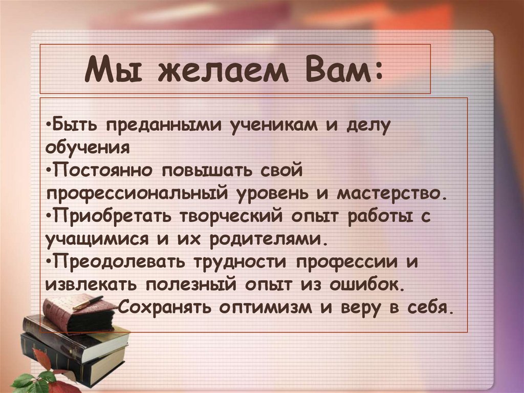 Мы желаем Вам:•Быть преданными ученикам и делу
