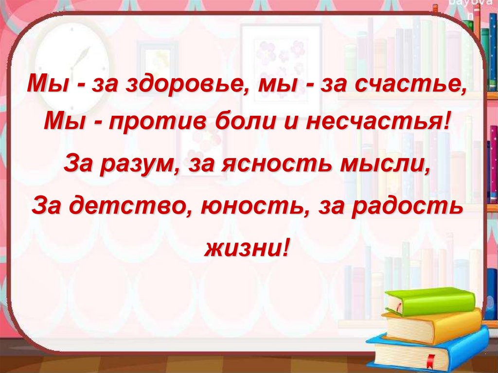 Мы - за здоровье, мы - за счастье,Мы - против боли и несчастья!