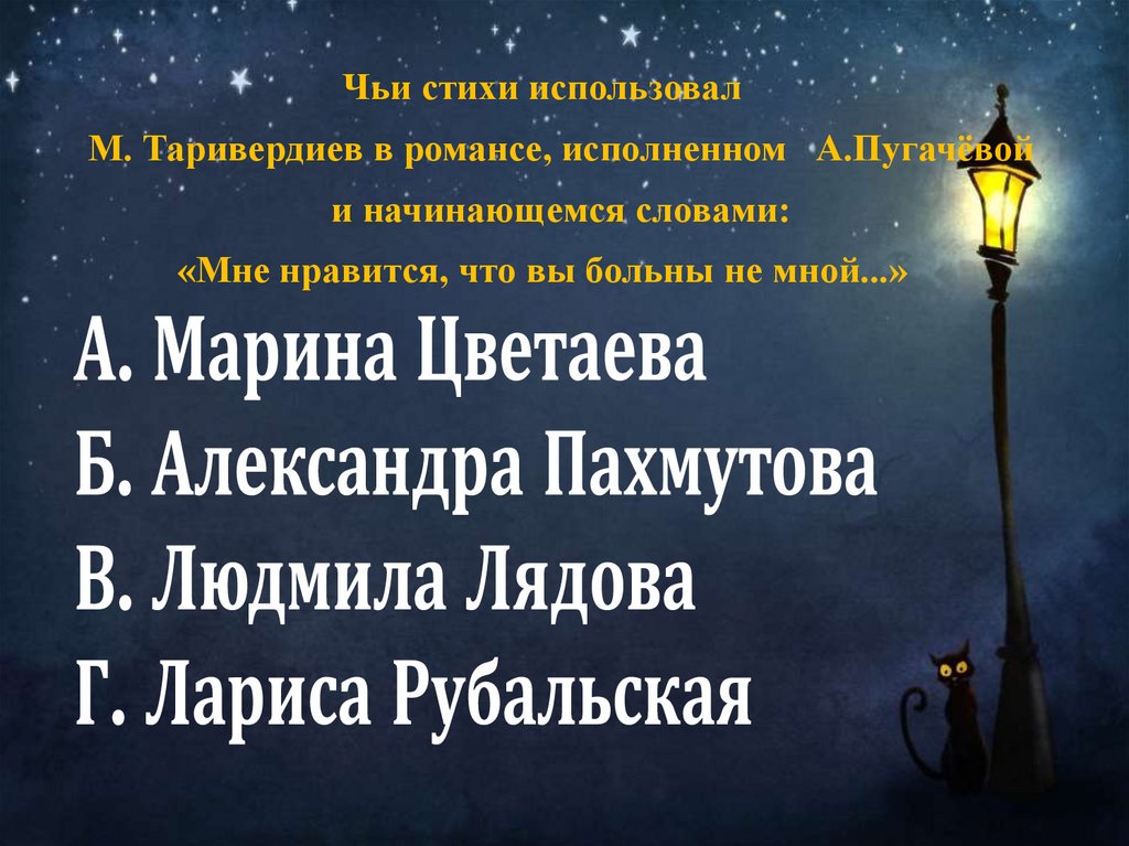 Чьи стихи использовалМ. Таривердиев в романсе, исполненном А.Пугачёвой