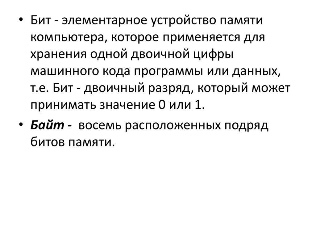 • Бит - элементарное устройство памятикомпьютера, которое применяется для