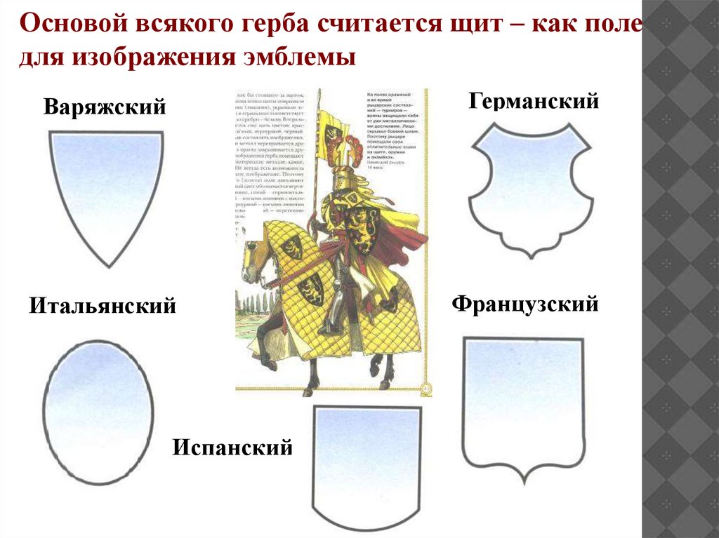 Основой всякого герба считается щит – как поледля изображения эмблемы