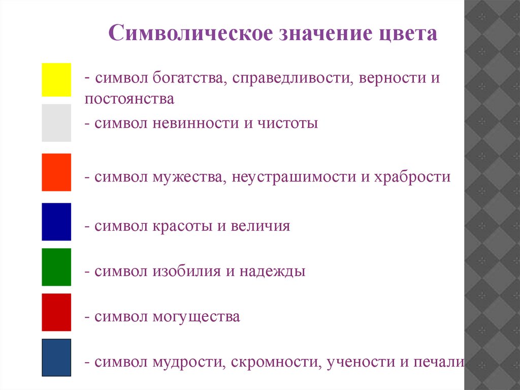Символическое значение цвета- символ богатства, справедливости, верности и