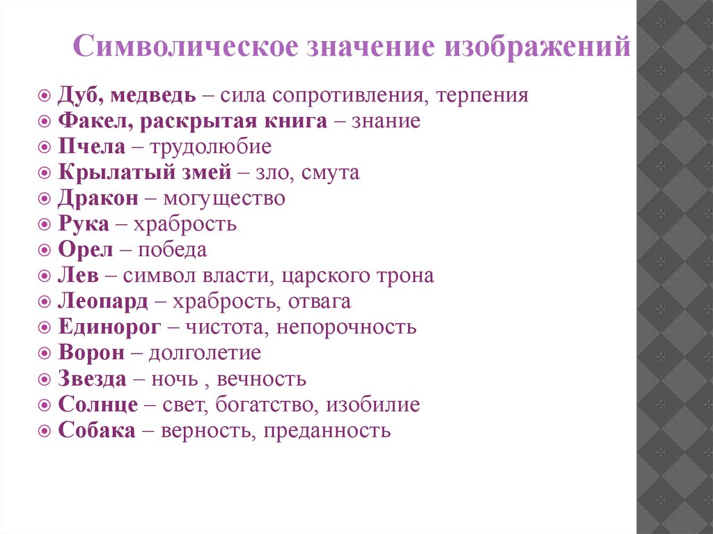 Символическое значение изображенийДуб, медведь – сила сопротивления, терпения