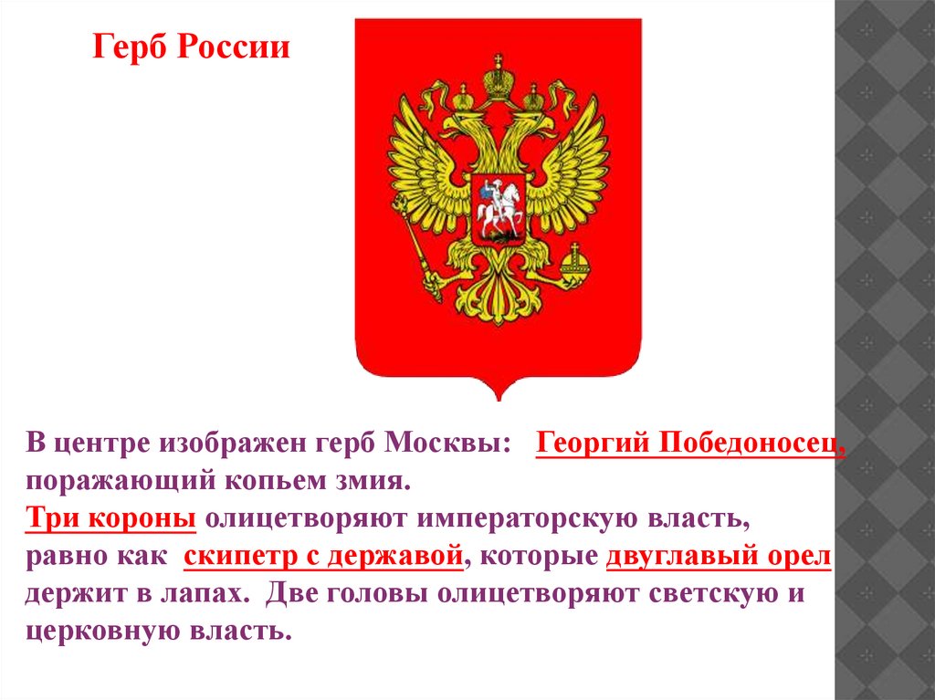 Герб РоссииВ центре изображен герб Москвы: Георгий Победоносец,