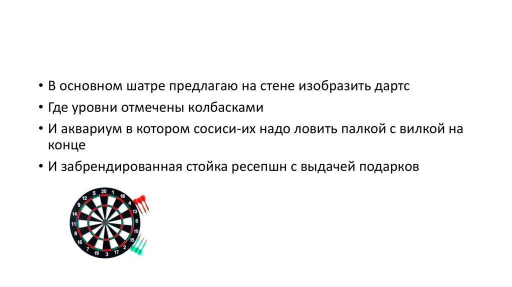 • В основном шатре предлагаю на стене изобразить дартс• Где уровни отмечены колбасками