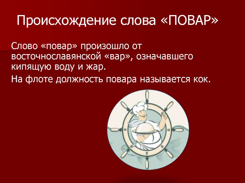 Происхождение слова «ПОВАР»Слово «повар» произошло от