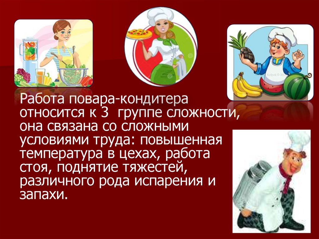 Работа повара-кондитераотносится к 3 группе сложности,