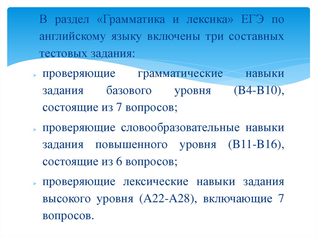 В раздел «Грамматика и лексика» ЕГЭ поанглийскому языку включены три составных