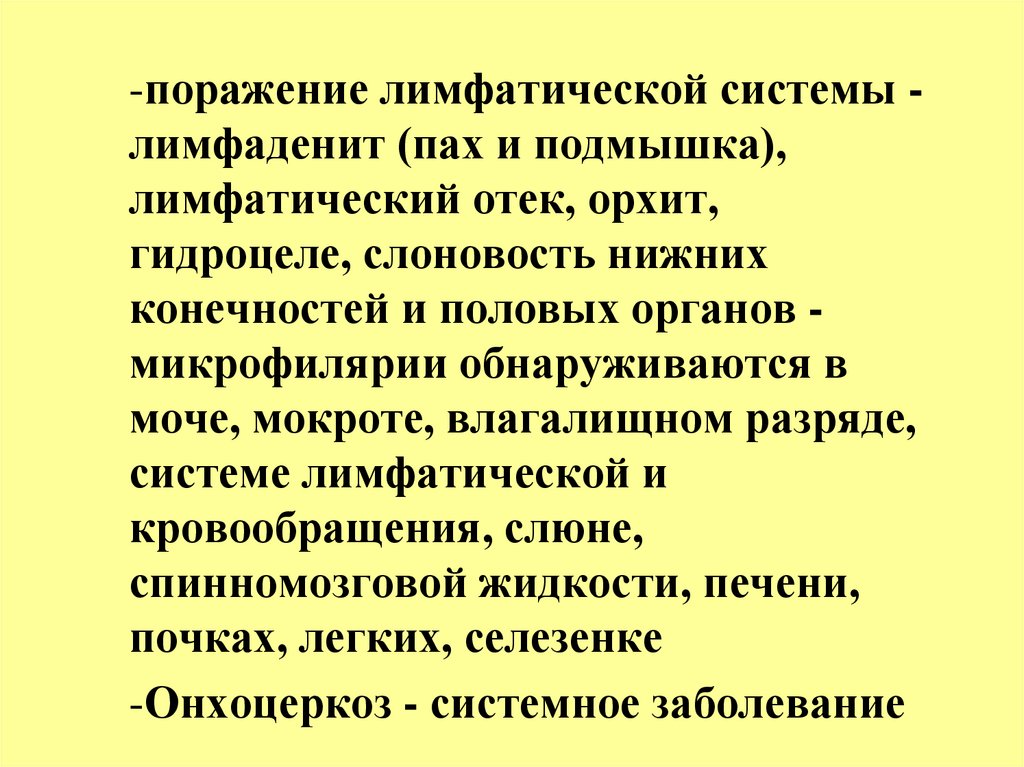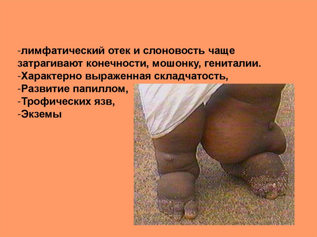 -поражение лимфатической системы лимфаденит (пах и подмышка),лимфатический отек, орхит,