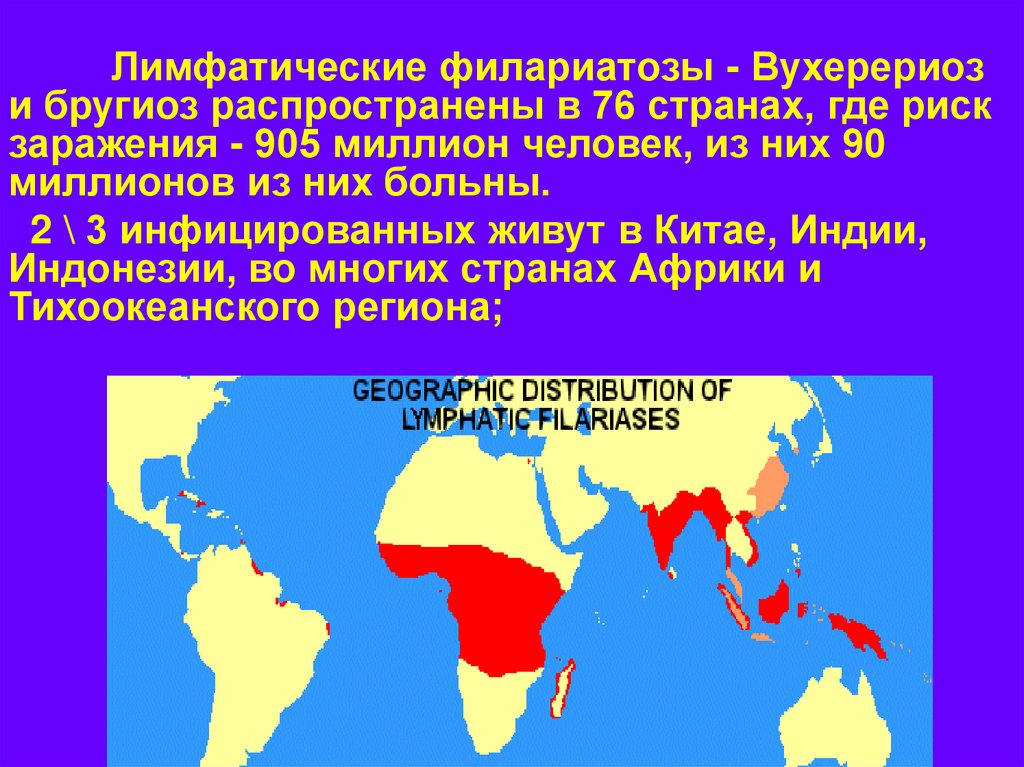 Лимфатические филариатозы - Вухерериози бругиоз распространены в 76 странах, где риск