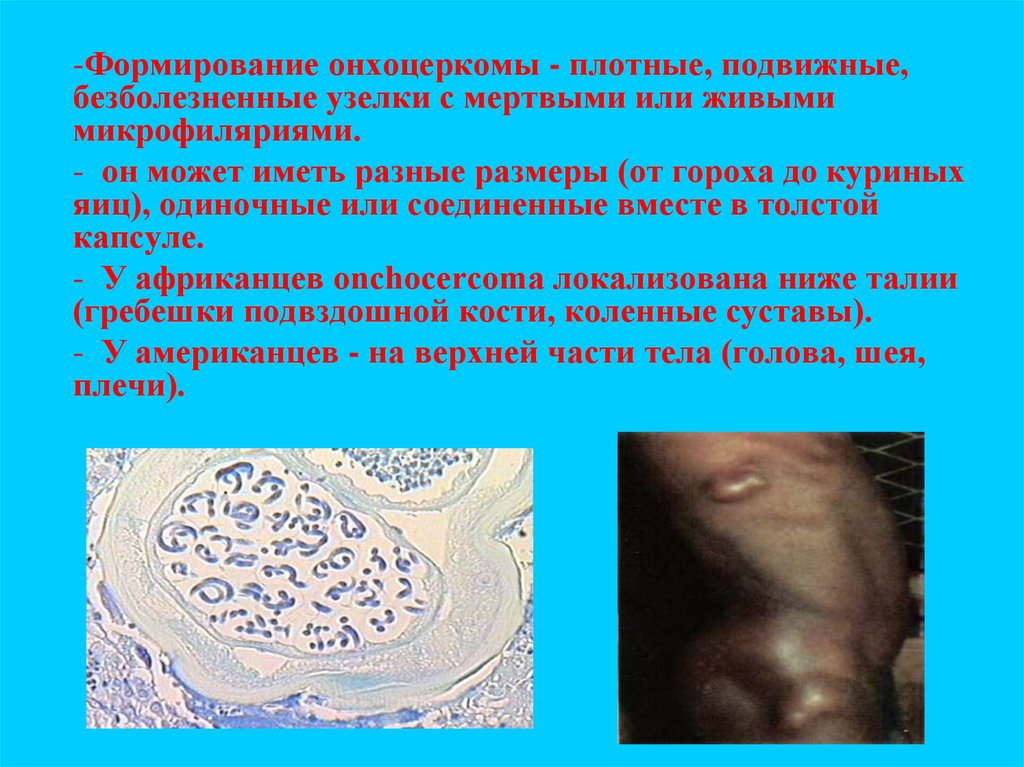 -Формирование онхоцеркомы - плотные, подвижные,безболезненные узелки с мертвыми или живыми