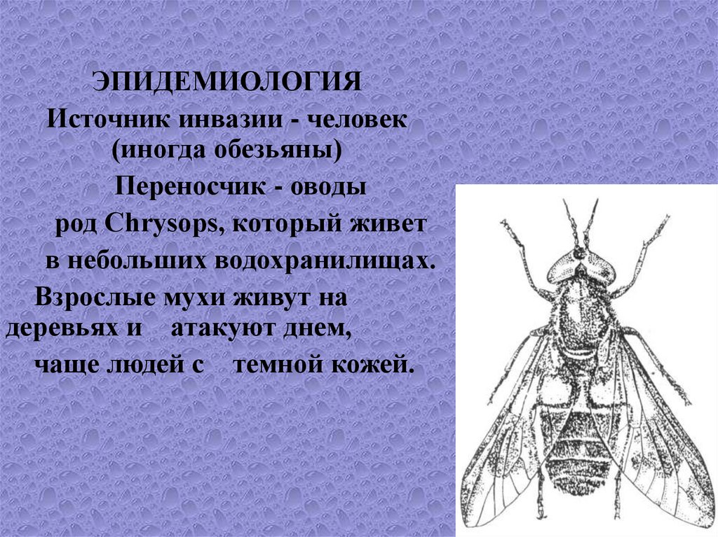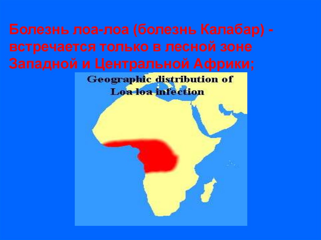Болезнь лоа-лоа (болезнь Калабар) встречается только в лесной зонеЗападной и Центральной Африки;