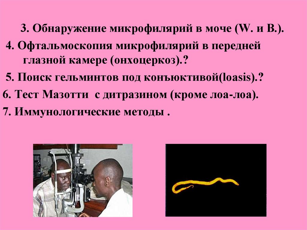 3. Обнаружение микрофилярий в моче (W. и B.).4. Офтальмоскопия микрофилярий в передней