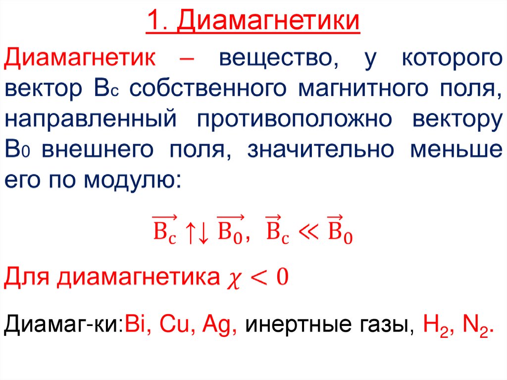 1. ДиамагнетикиДиамаг-ки:Bi, Cu, Ag, инертные газы, H2, N2.