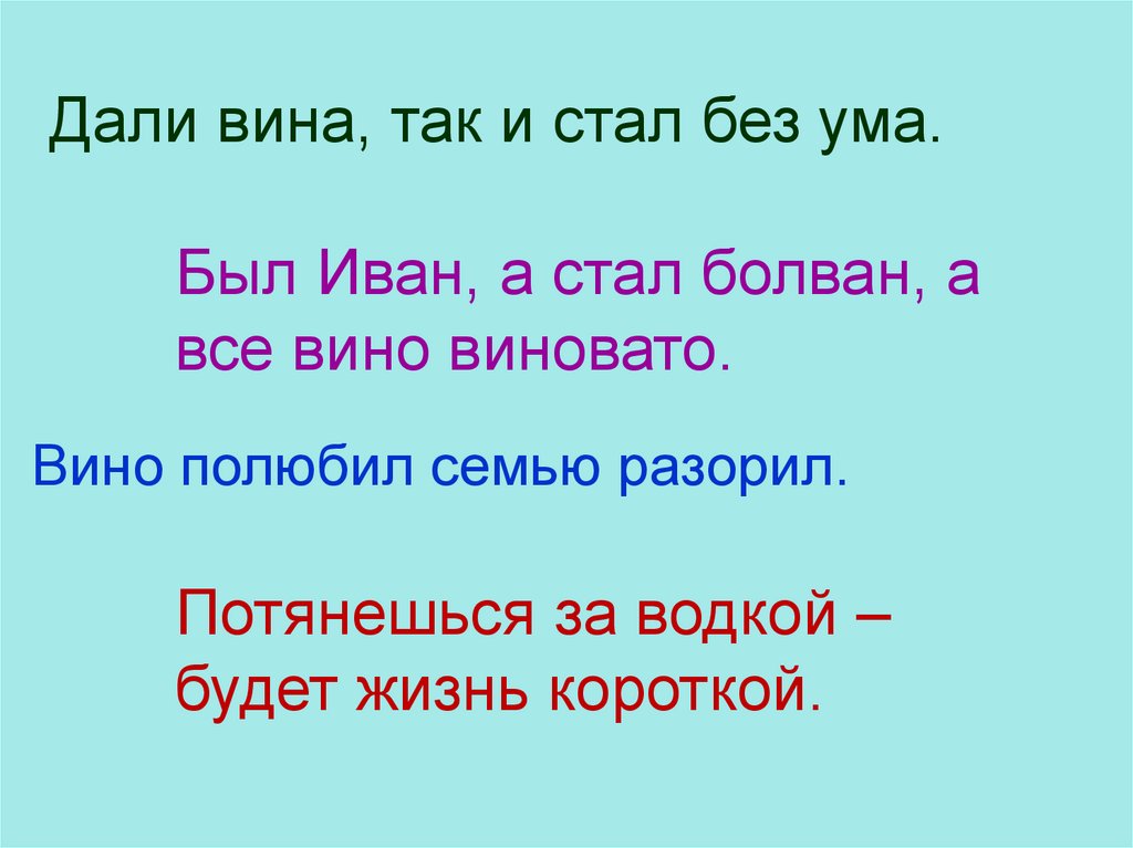 Дали вина, так и стал без ума.Был Иван, а стал болван, а
