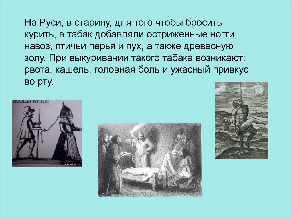 На Руси, в старину, для того чтобы броситькурить, в табак добавляли остриженные ногти,