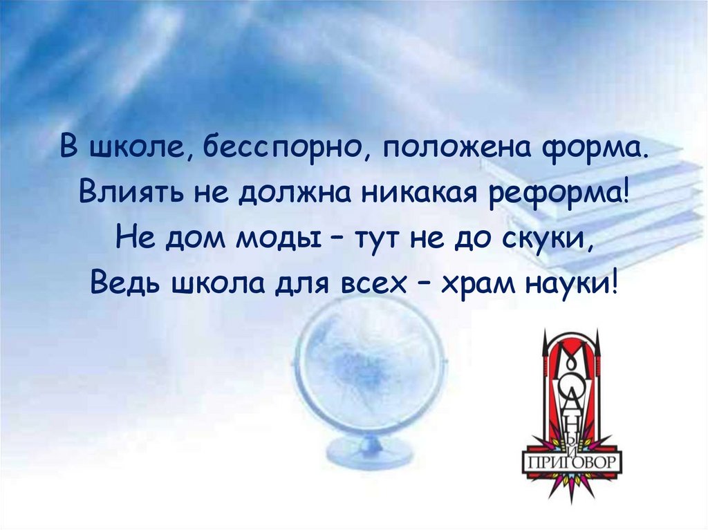 В школе, бесспорно, положена форма.Влиять не должна никакая реформа!