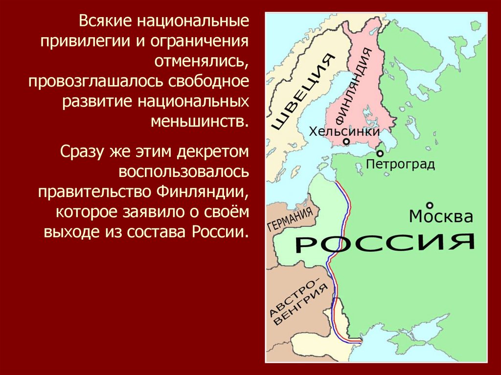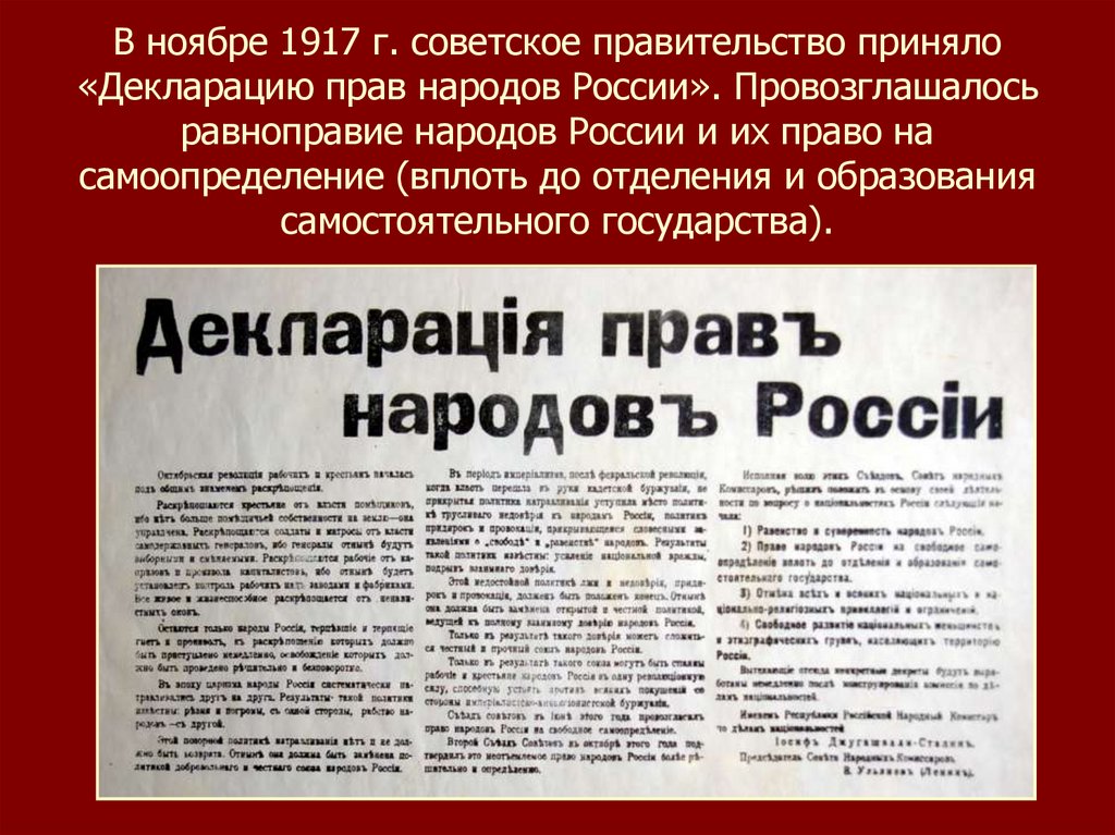 В ноябре 1917 г. советское правительство приняло«Декларацию прав народов России». Провозглашалось