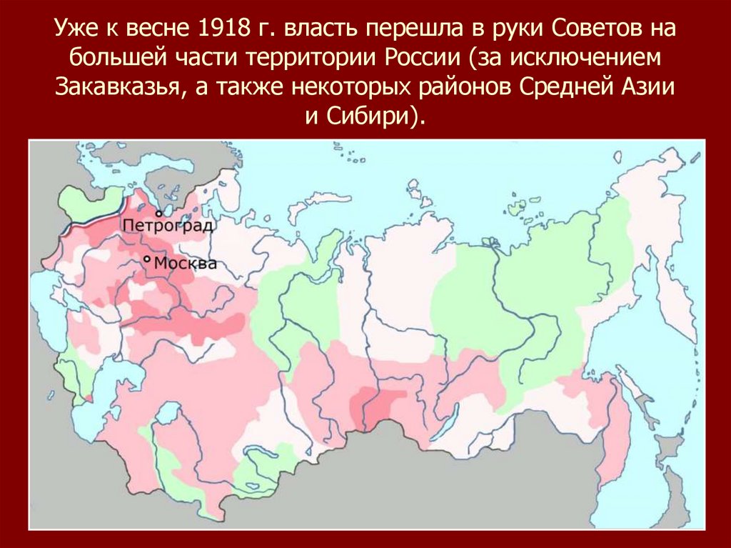 Уже к весне 1918 г. власть перешла в руки Советов набольшей части территории России (за исключением