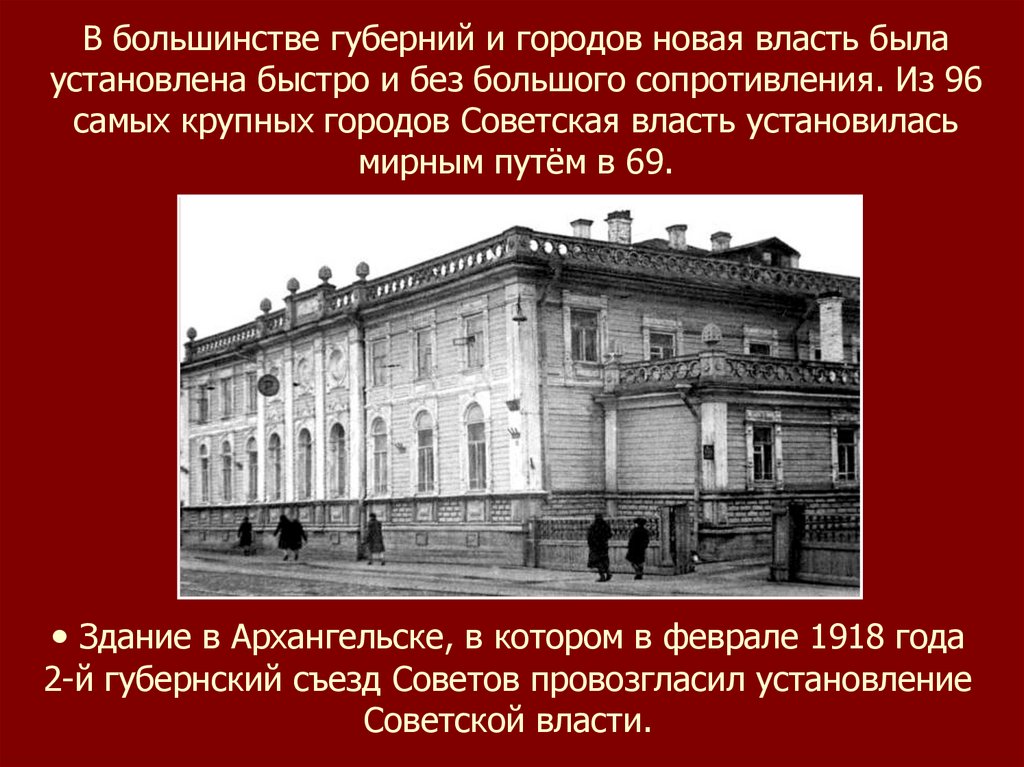 В большинстве губерний и городов новая власть былаустановлена быстро и без большого сопротивления. Из 96
