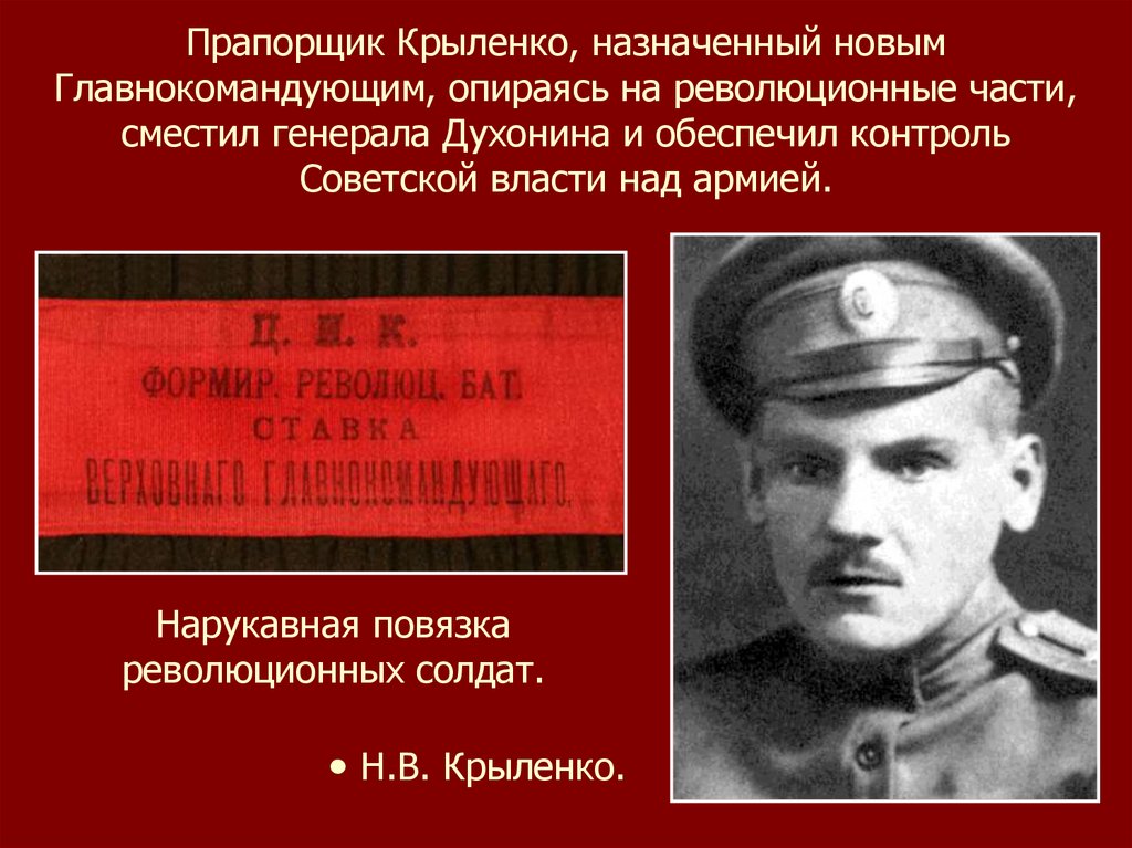 Прапорщик Крыленко, назначенный новымГлавнокомандующим, опираясь на революционные части,