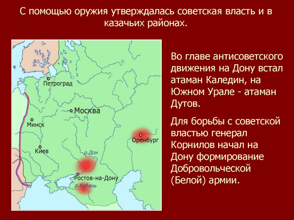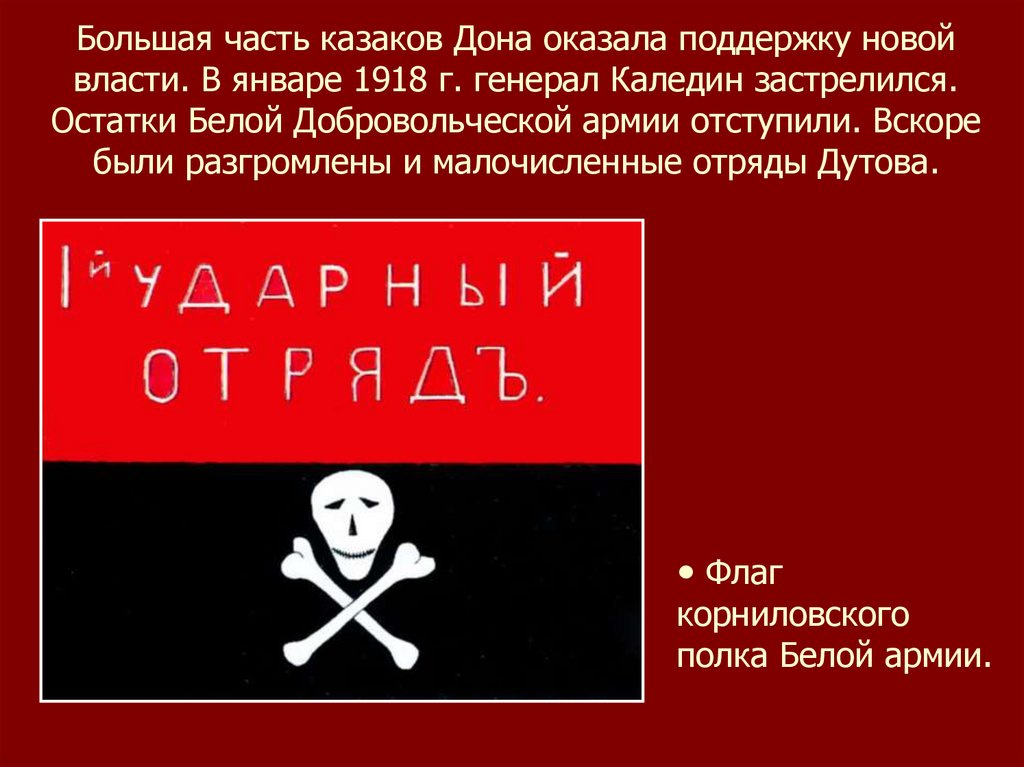 Большая часть казаков Дона оказала поддержку новойвласти. В январе 1918 г. генерал Каледин застрелился.