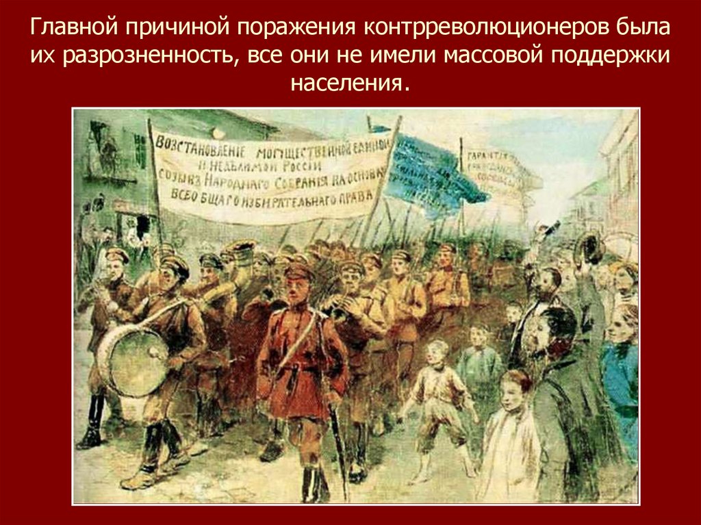 Главной причиной поражения контрреволюционеров былаих разрозненность, все они не имели массовой поддержки