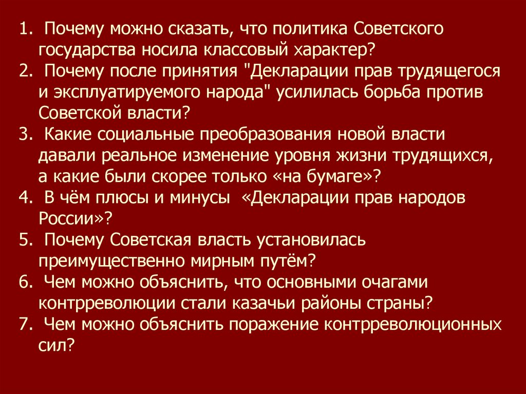 1. Почему можно сказать, что политика Советскогогосударства носила классовый характер?