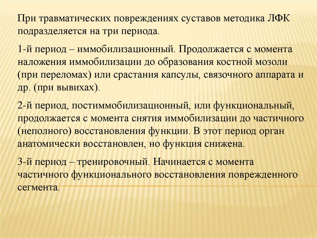 При травматических повреждениях суставов методика ЛФКподразделяется на три периода.