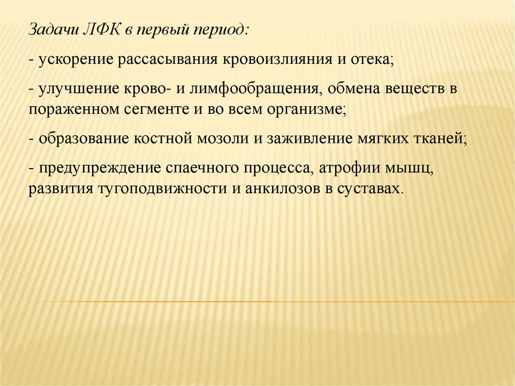 Задачи ЛФК в первый период:- ускорение рассасывания кровоизлияния и отека;