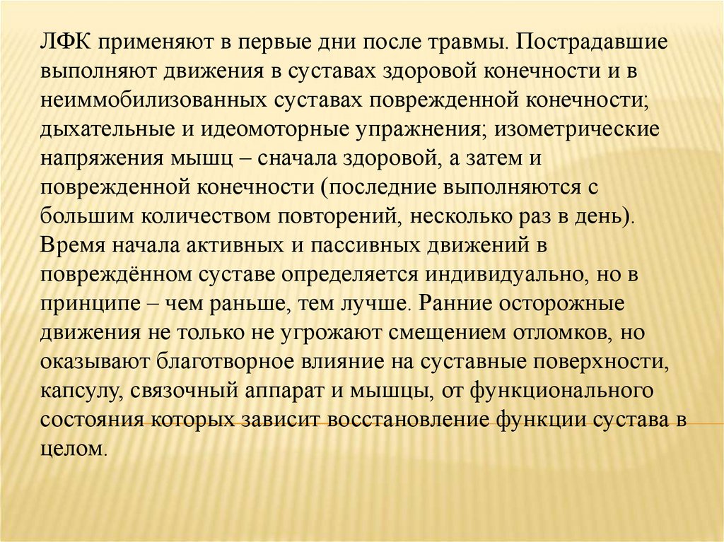 ЛФК применяют в первые дни после травмы. Пострадавшиевыполняют движения в суставах здоровой конечности и в