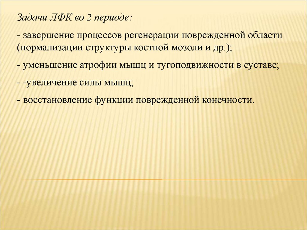 Задачи ЛФК во 2 периоде:- завершение процессов регенерации поврежденной области