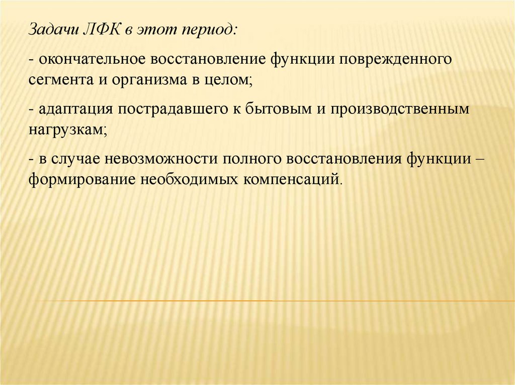 Задачи ЛФК в этот период:- окончательное восстановление функции поврежденного