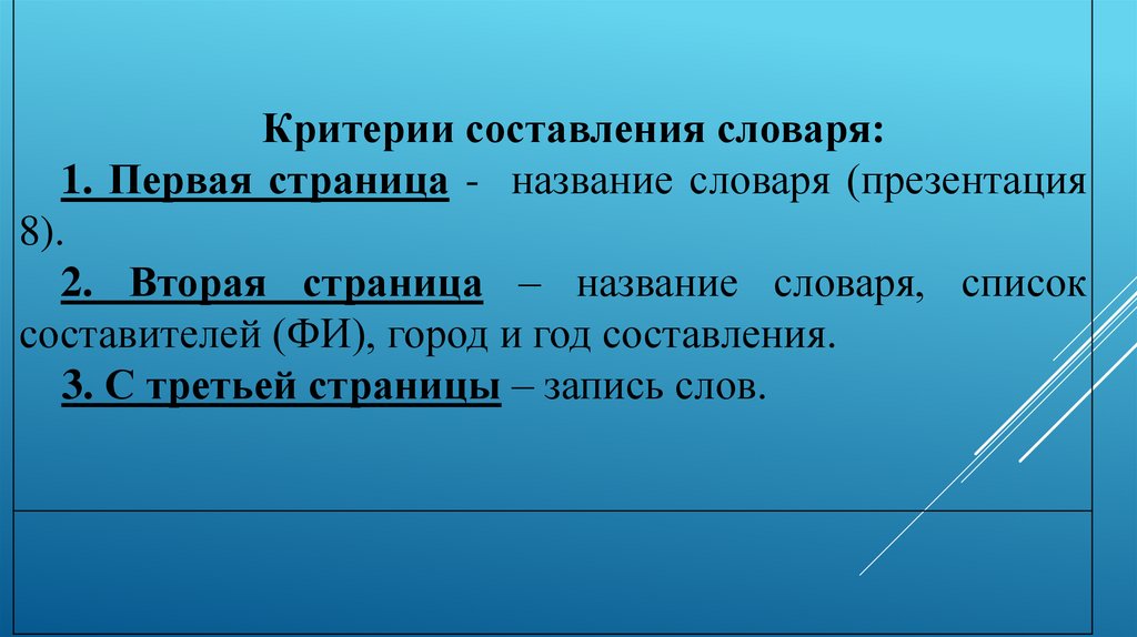Критерии составления словаря:1. Первая страница - название словаря (презентация