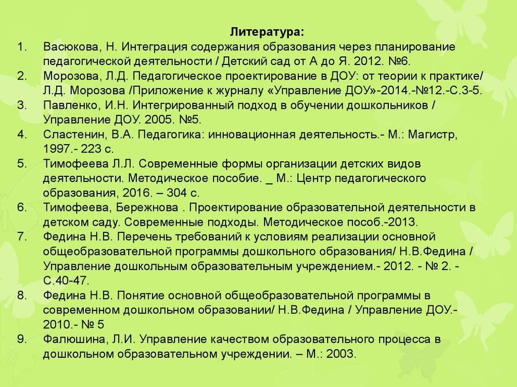 современном дошкольном образовании/ Н.В.Федина / Управление ДОУ.2010.- № 5
