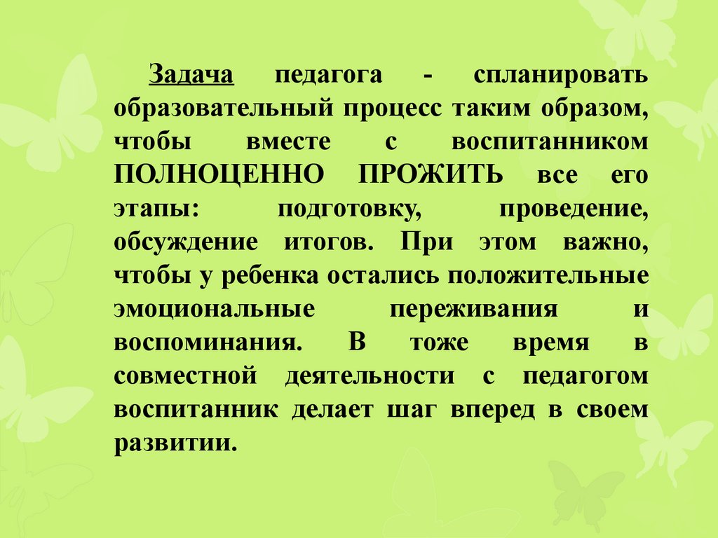 Задача педагога - спланироватьобразовательный процесс таким образом,