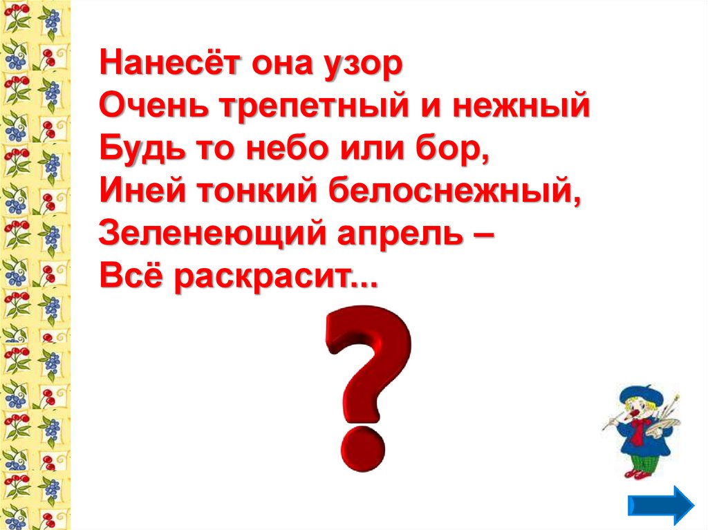 Нанесёт она узорОчень трепетный и нежный